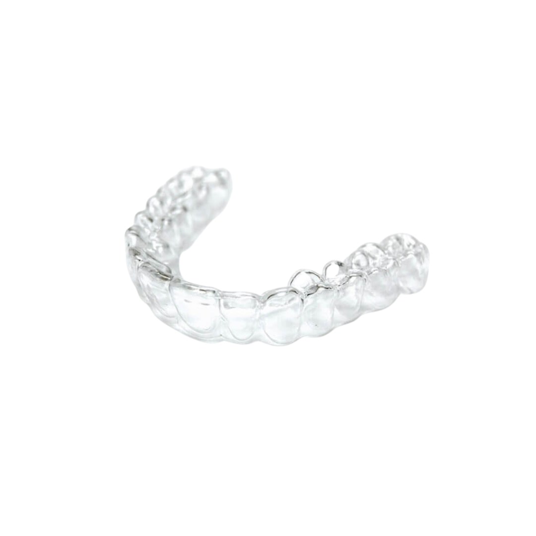 Op maat gemaakte aligners voor de onderkaak. Dit is een volledige alignerbehandeling van Orthoclub. Inclusief nachtbeugel.